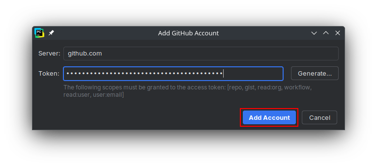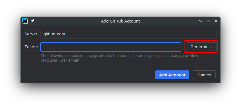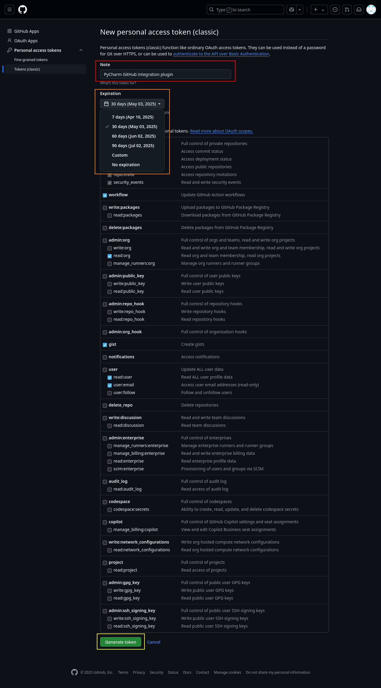 Once you sign in, you will be redirected to the page for creating tokens. It should already be prepopulated with a name and the required access settings. The default name will be "PyCharm GitHub integration plugin", which you can change. You may also want to use the expiry date dropdown to set the expiry date to after your COMP-1510 class ends, or set it to never expire. You can also adjust the settings for what the token is allowed to access, but for COMP-1510's purposes, you shouldn't need to change anything. When you're done configuring the token, scroll to the borrom of the page and click