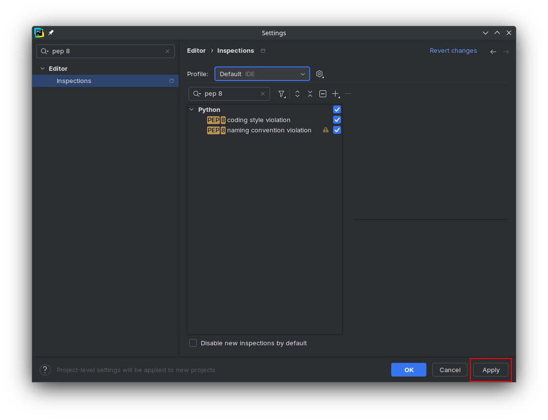 Profiledropdown, and selectDefault IDE. This ensures that the settings are applied to the entire IDE and is used as the default for all new projects; instead of being applied to only the currently open project. -