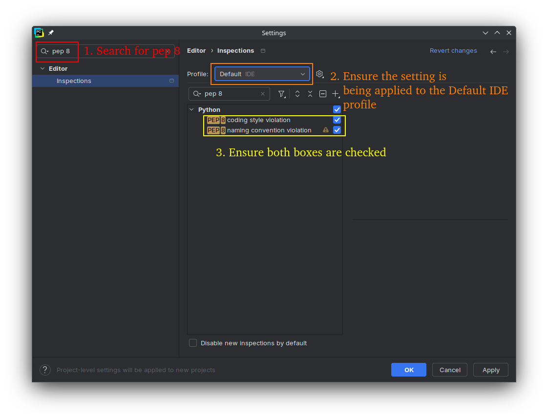PEP 8 naming convention violationand set the same three parameters as specified in the previous step. This step and the previous step will result in a yellow line under any code that does not conform to PEP-8 formatting. When programming, you can hover your mouse over the yellow line to see the specific PEP-8 rule that the code does not conform to, allowing you to fix it.