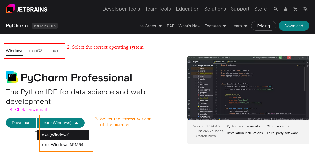 PyCharm Professional supports Windows, Mac, and Linux, and the website should automatically detect your operating system. If it is incorrect, click on the correct one from the choices just below the header.