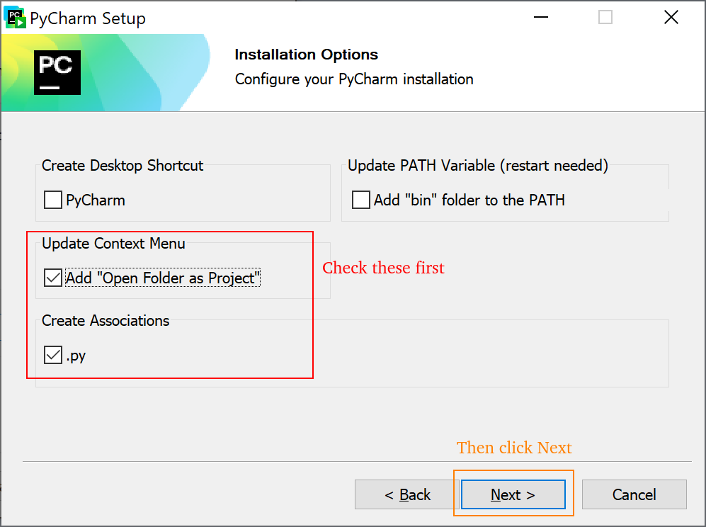 Open folder as projectandAssociate .py files, as these will allow for quicker access to PyCharm. Then click next.