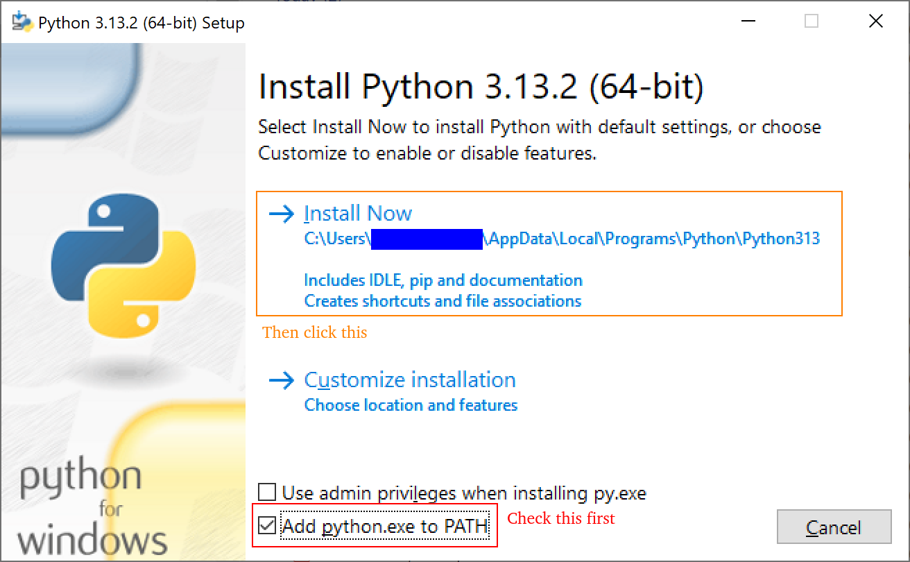 Add python to PATH, to make Python more easily accessible on your terminal, and then clickInstall Now.